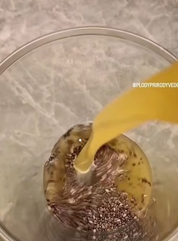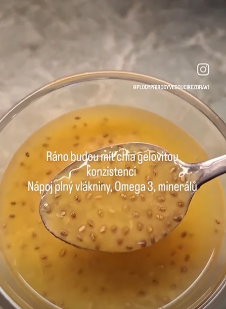 1 lžička Chia semínek, zalít 250ml pomerančové džusu, dát do lednice přes noc a ráno máte nápoj plný vlákniny, Omega 3 a vitamínů.