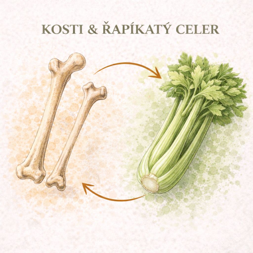 Řapíkatý celer svým tvarem připomíná dlouhé kosti. Obsahuje vitamín K, vápník, hořčík a další minerální látky důležité pro kostní metabolismus.